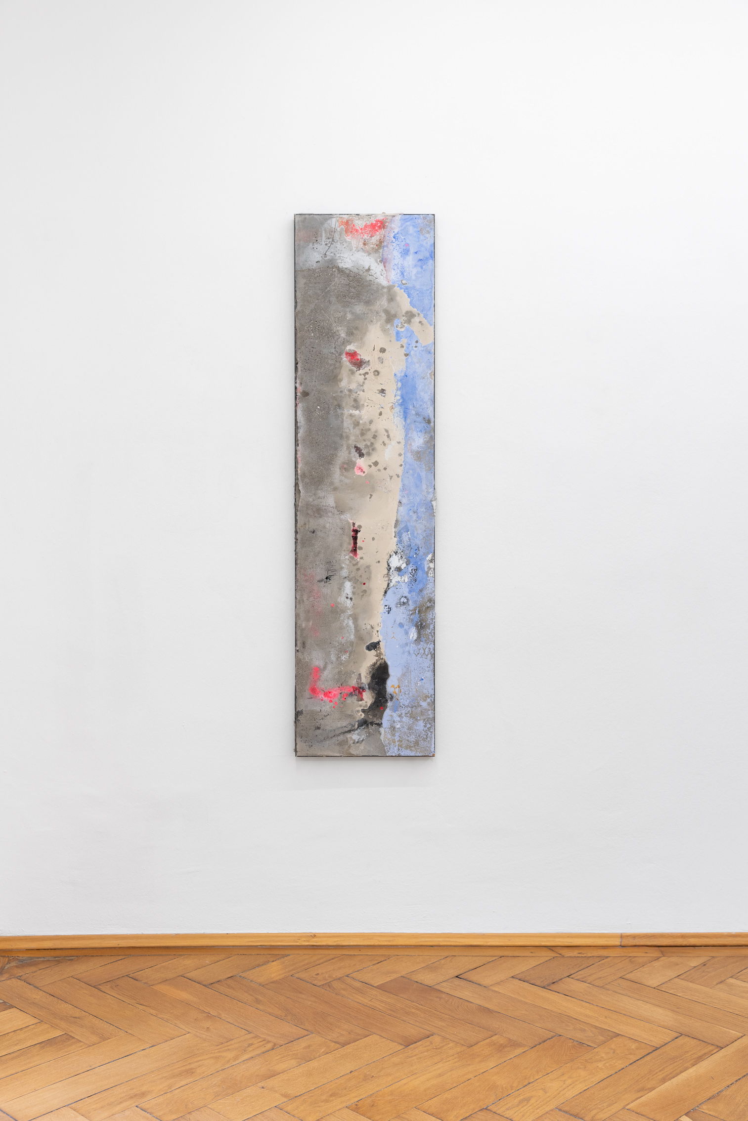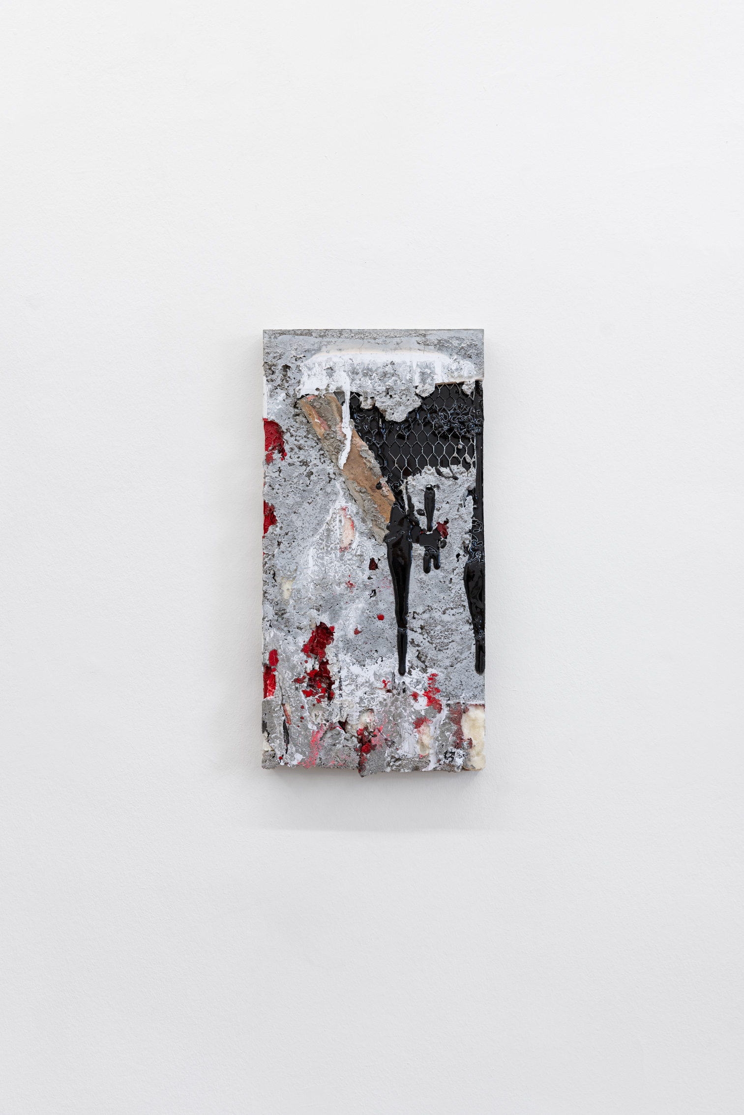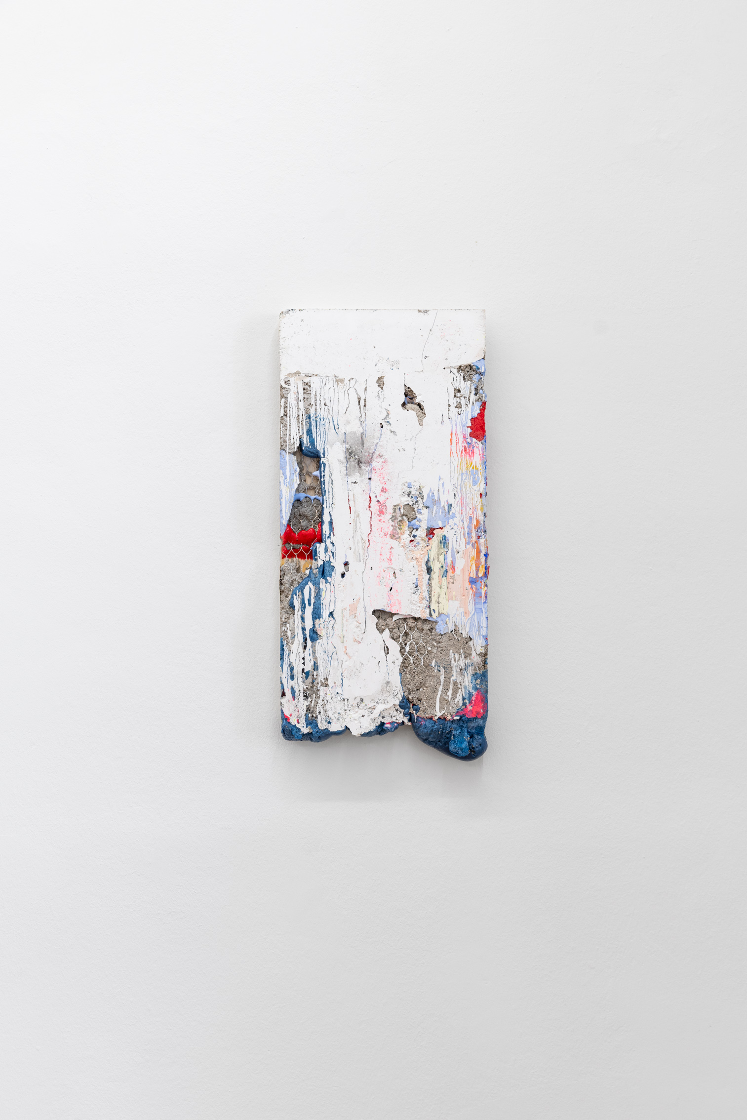 Britta Rettberg is pleased to present a series of new works for Patrick Ostrowsky’s second comprehensive solo exhibition. The first series called “reliefs”, are smaller sized paintings made of re-used wooden floor panels over which numerous layers of materials collide, such as epoxy, cement or pigment. These materials are poured over the small box-framed support structure which in turn create a semi-translucent abstract painting/sculpture. The second group of works, also wall-based, are called “almsboxes” which feel and look more like small cabinets, mailboxes or other closable containers. Some of them let one peak inside, some of them have perforated metal sheets covering up the surface, while others yet are sealed with a plexiglass, holding an amalgam of objects and debris enclosed. The third series of works consists of a family of six, larger-than-life floor-based sculptures entitled „Structures of Existence“.