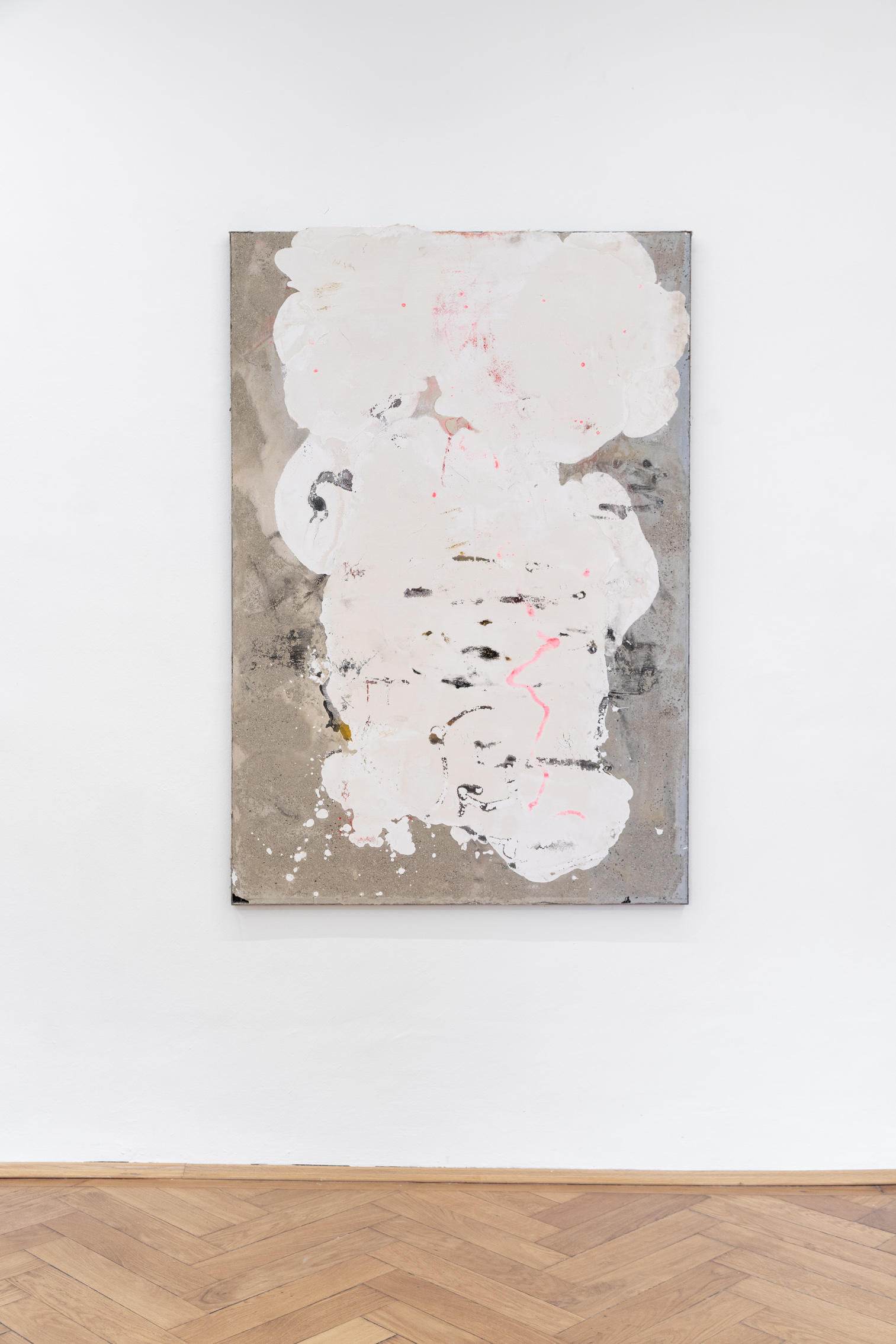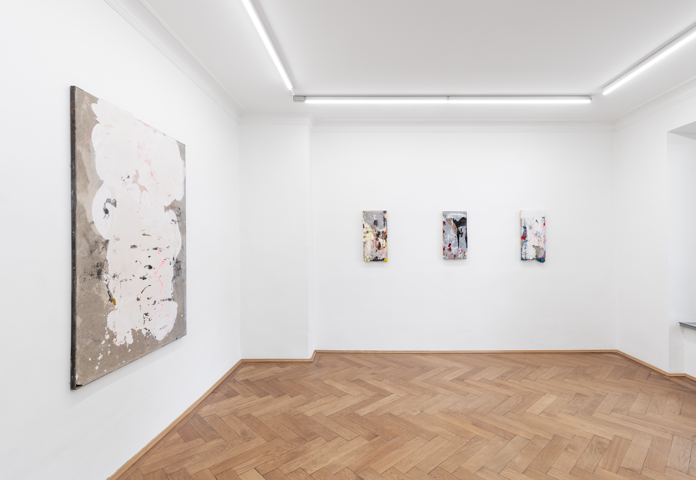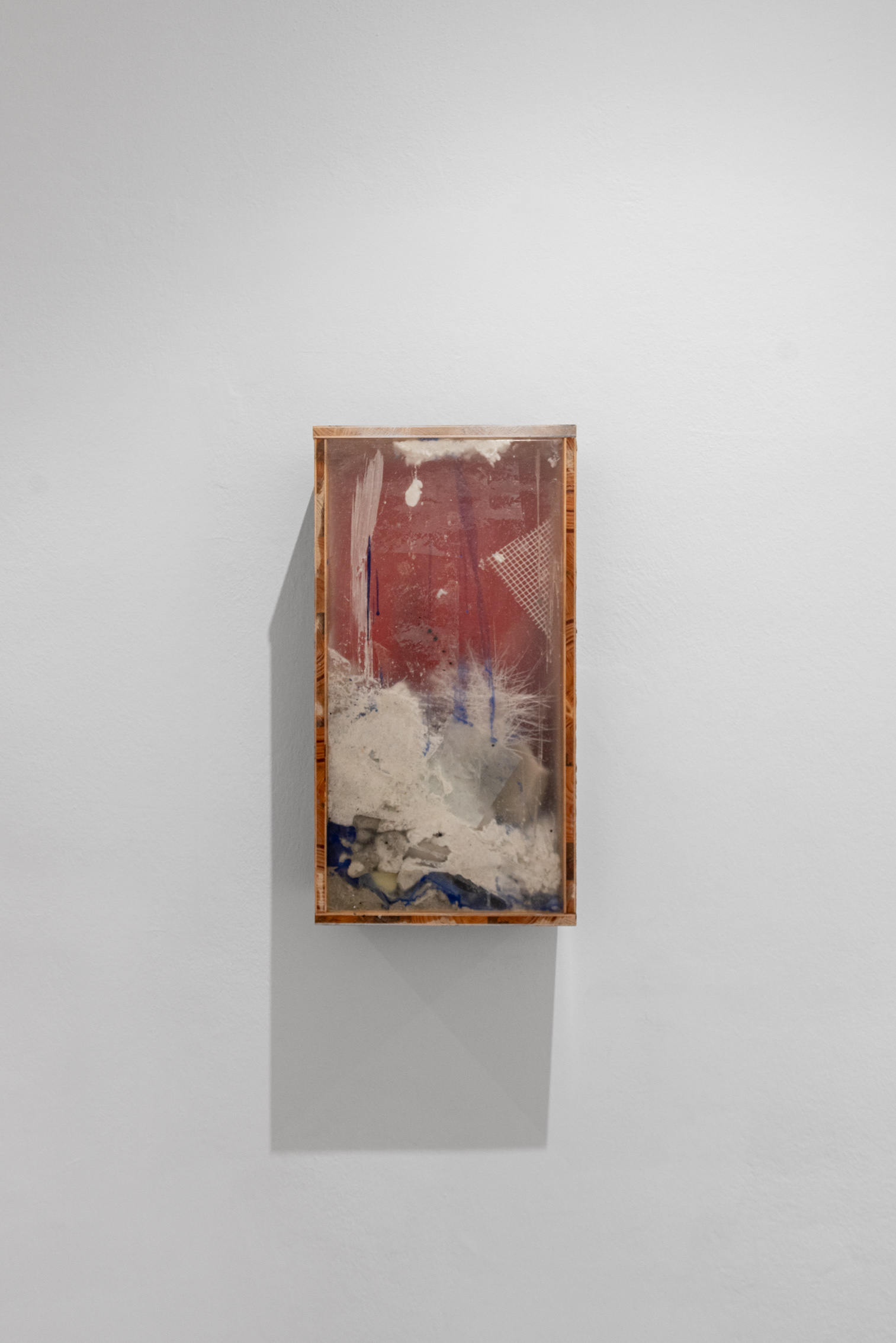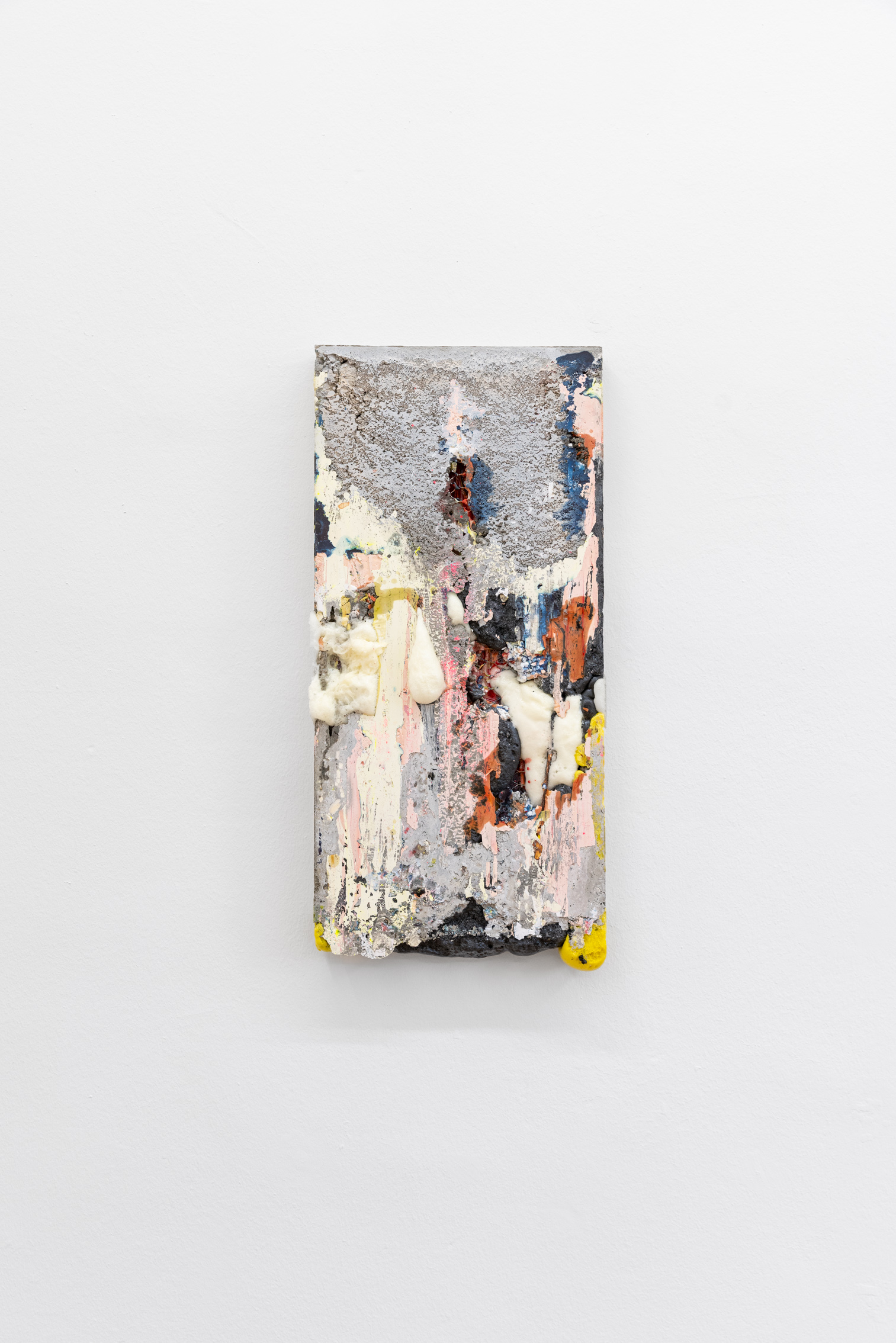 Britta Rettberg is pleased to present a series of new works for Patrick Ostrowsky’s second comprehensive solo exhibition. The first series called “reliefs”, are smaller sized paintings made of re-used wooden floor panels over which numerous layers of materials collide, such as epoxy, cement or pigment. These materials are poured over the small box-framed support structure which in turn create a semi-translucent abstract painting/sculpture. The second group of works, also wall-based, are called “almsboxes” which feel and look more like small cabinets, mailboxes or other closable containers. Some of them let one peak inside, some of them have perforated metal sheets covering up the surface, while others yet are sealed with a plexiglass, holding an amalgam of objects and debris enclosed. The third series of works consists of a family of six, larger-than-life floor-based sculptures entitled „Structures of Existence“.