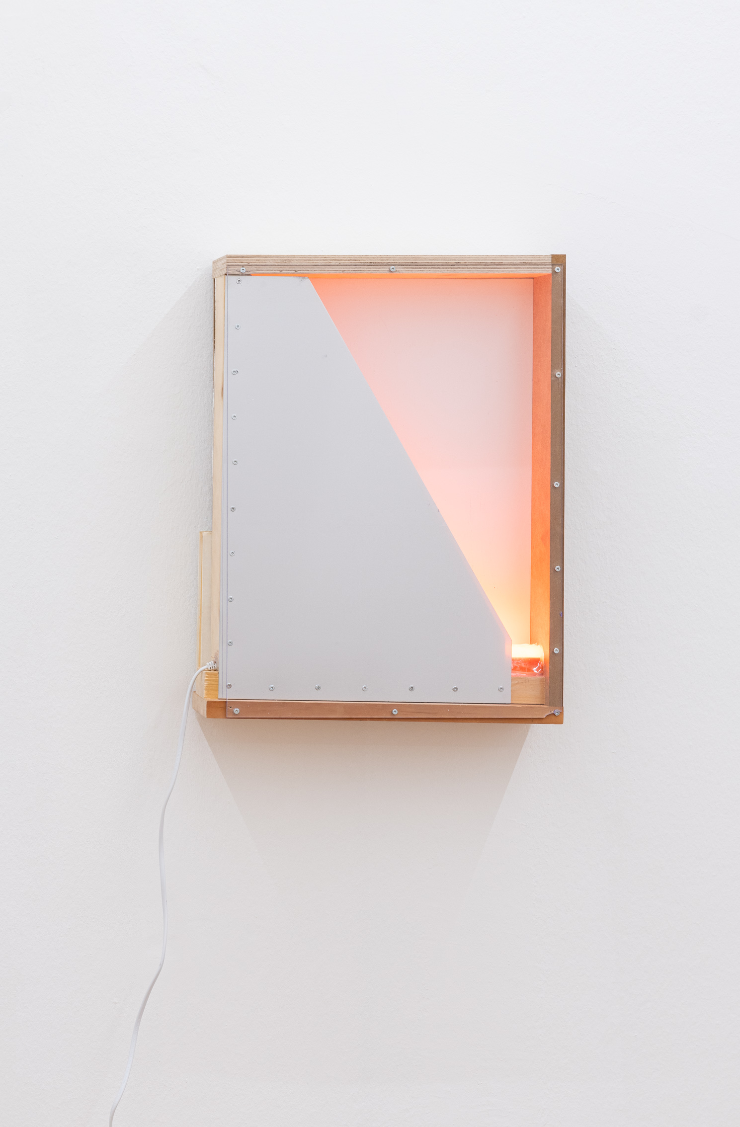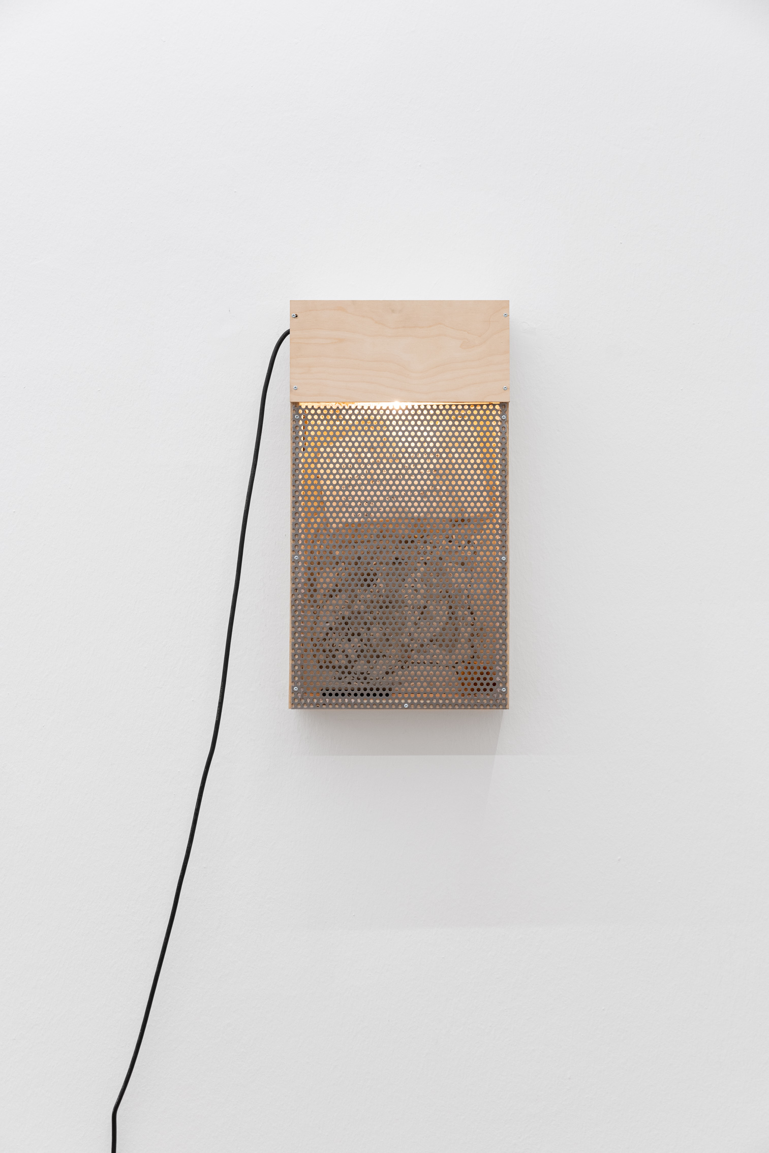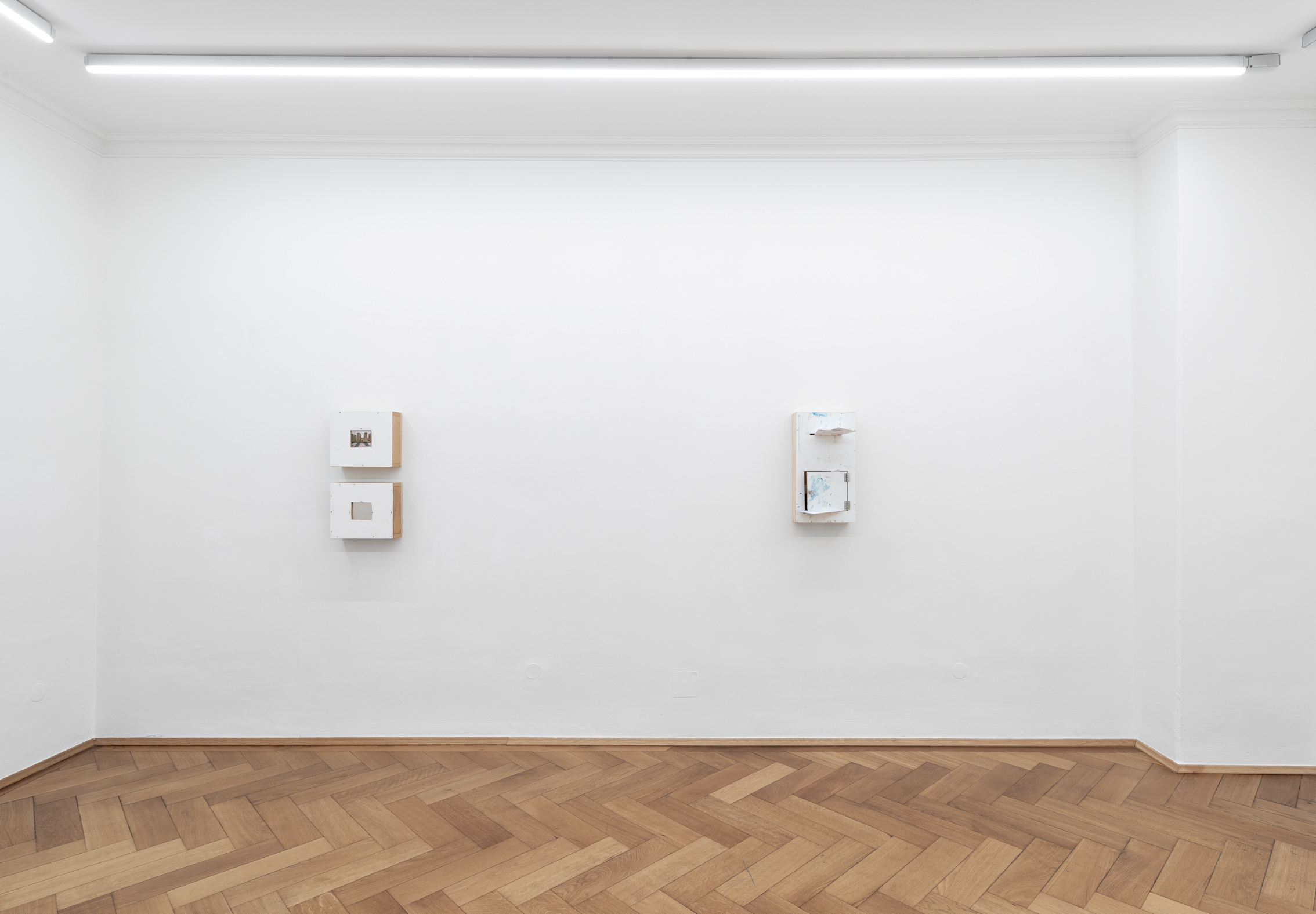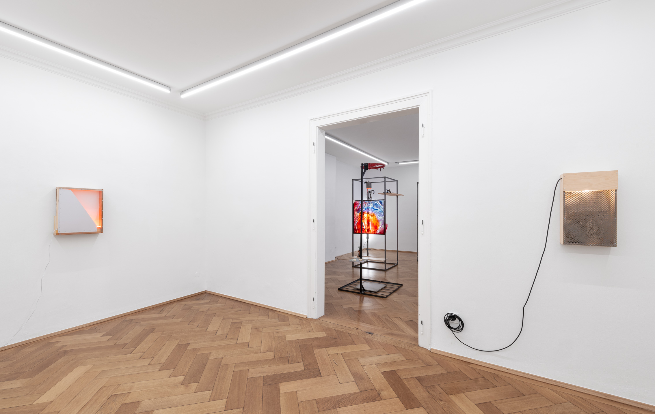 Skeleton metal outlines in the form of cell/boxes assume an air of a virtual shrine. They can also be read as some sort of time travel apparatus, where a normal sized human can step into. More than that though, they are each unique in what they hold within their frames. Some have wooden or acrylic paneling integrated, others have ceramic objects sitting atop shelves, then again others have light fixtures integrated, while another set of the cells integrate ready-mades such as basketball hoop or candles, an iPhone or some coins. The eye cannot help to skip from house-hold items, everyday object to more abstract elements, like washes of paint, inscriptions, painterly surfaces or ceramic figurines that act as candleholders.