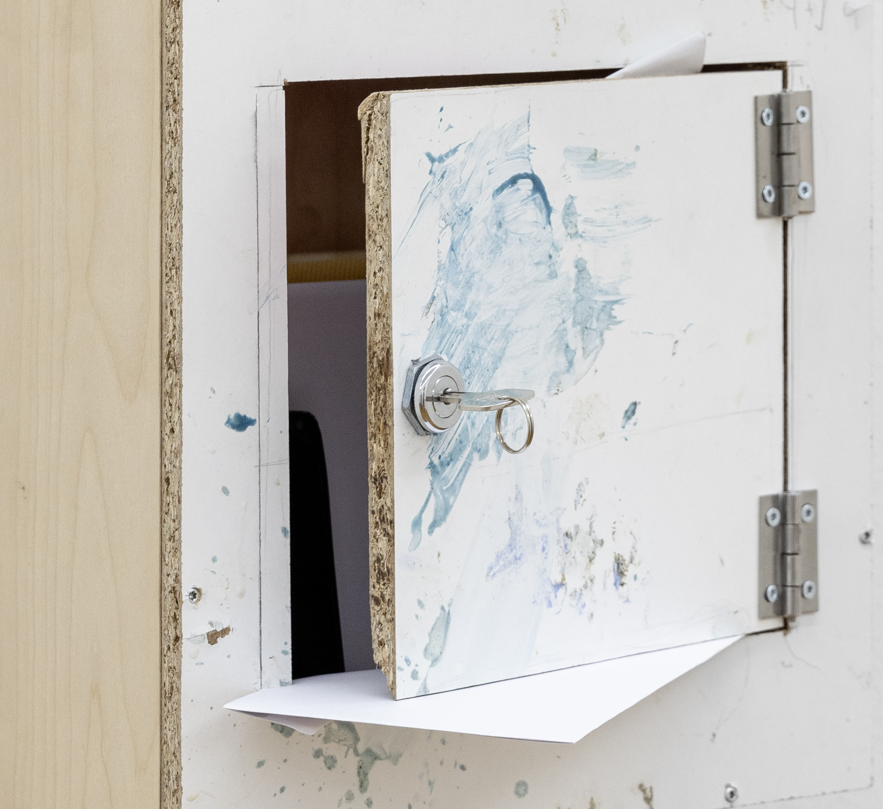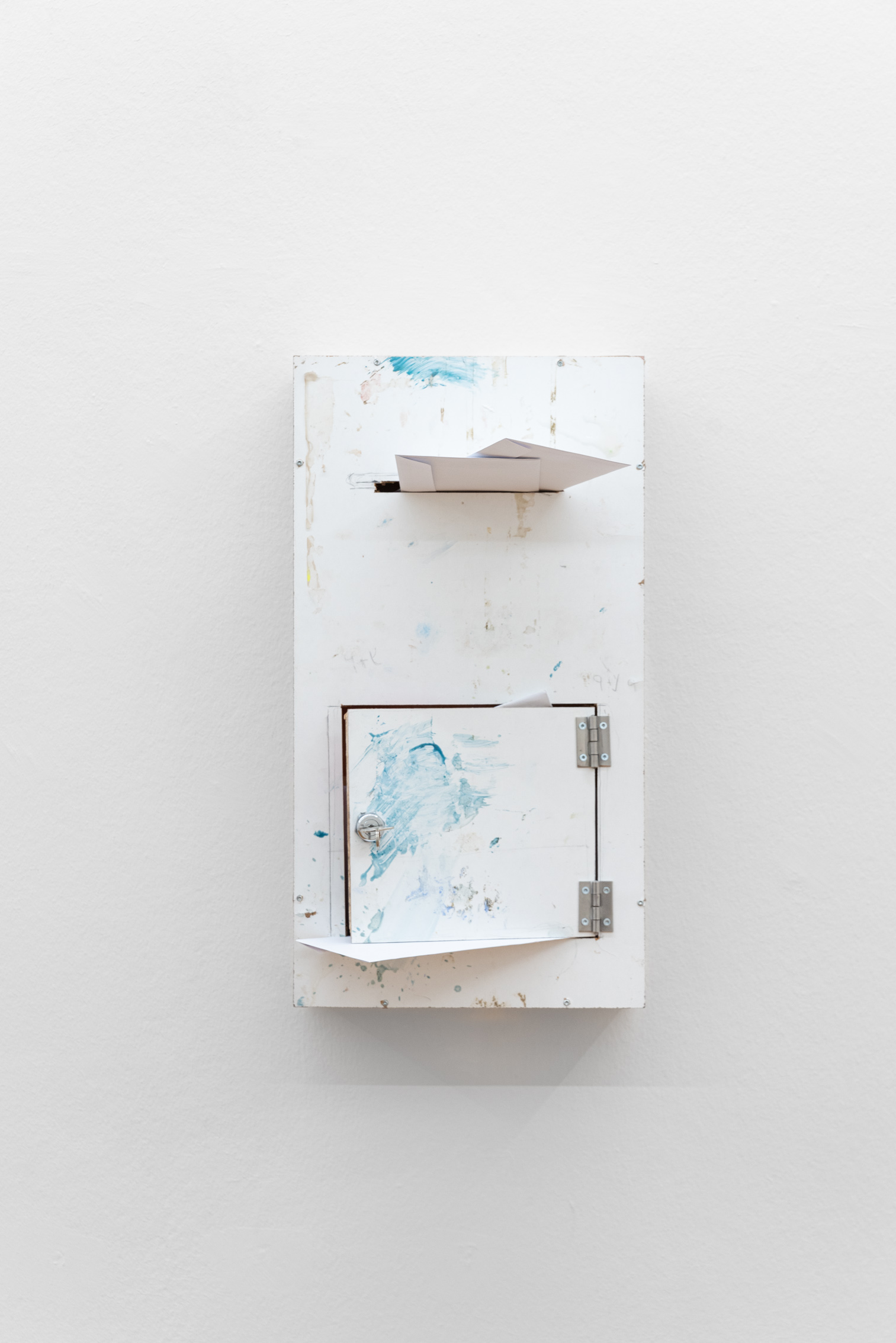 A common trait of all works in the exhibition is that they all tell tales: of experiences, deja-vus and personal touches, without actually portraying a specific persona. They touch upon a shared experience of the past and now but more so they induce a poetic dance between figurative and abstract moments, they ask about the where and now and poke in the end at one’s ability to self-reflect. What do these objects mean to you, who left them here, what do they behold. The act of wanting to find out more, being curious or wanting to uncover the hidden story behind all these objects lays at the core of this installation. What makes this dialogue refreshing is that we are not only looking at left behind, used objects but that we are constantly also triggered by small artistic interventions which immediately pull us out of a more didactic way of reading things, our inquisitive search for a version of truth is regularly interrupted by a moment of lamentation over an artistic vase there, or a painting here. An outer frame begging to examine the inner one. A marveling forth and back, between micro and macro between art and life.