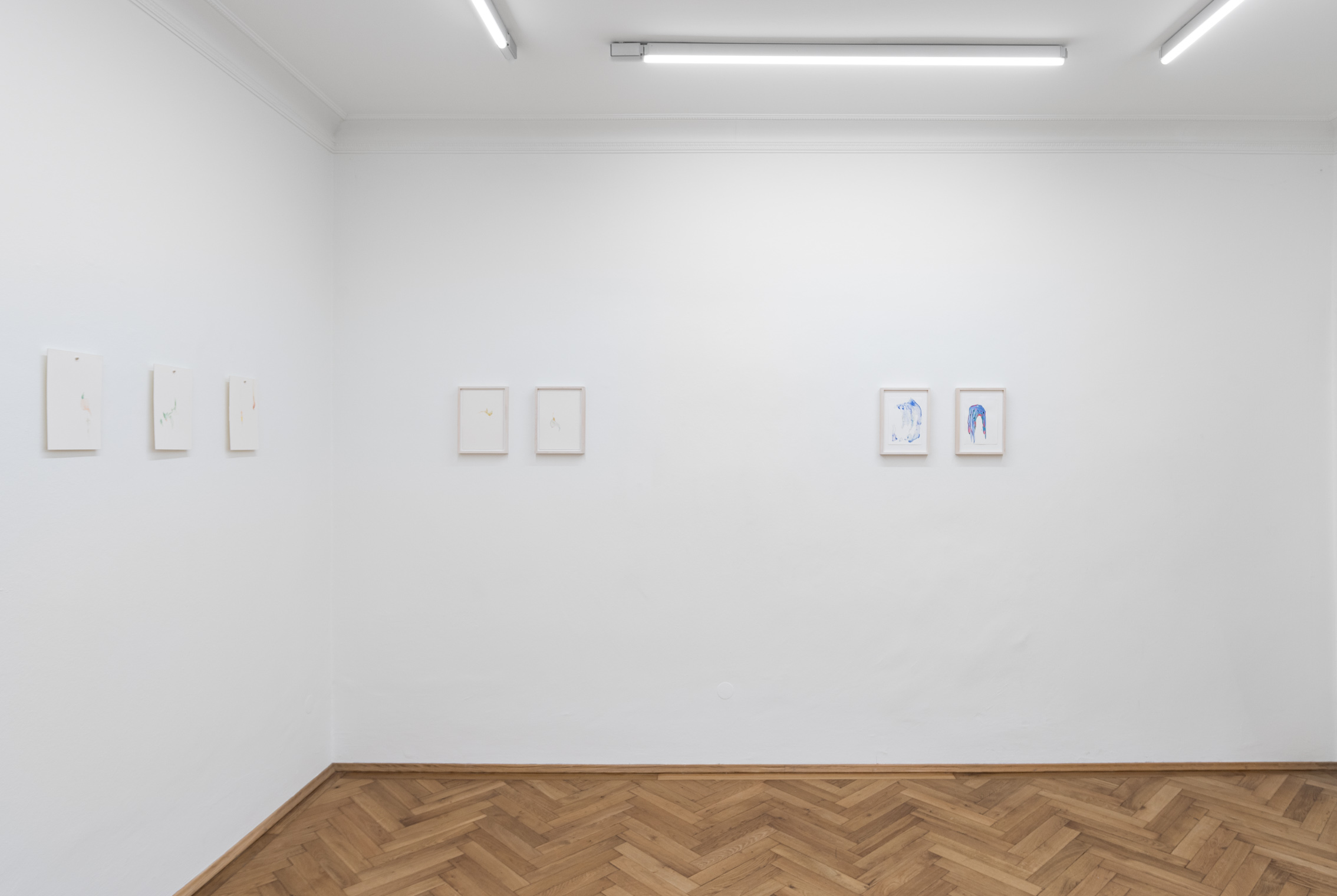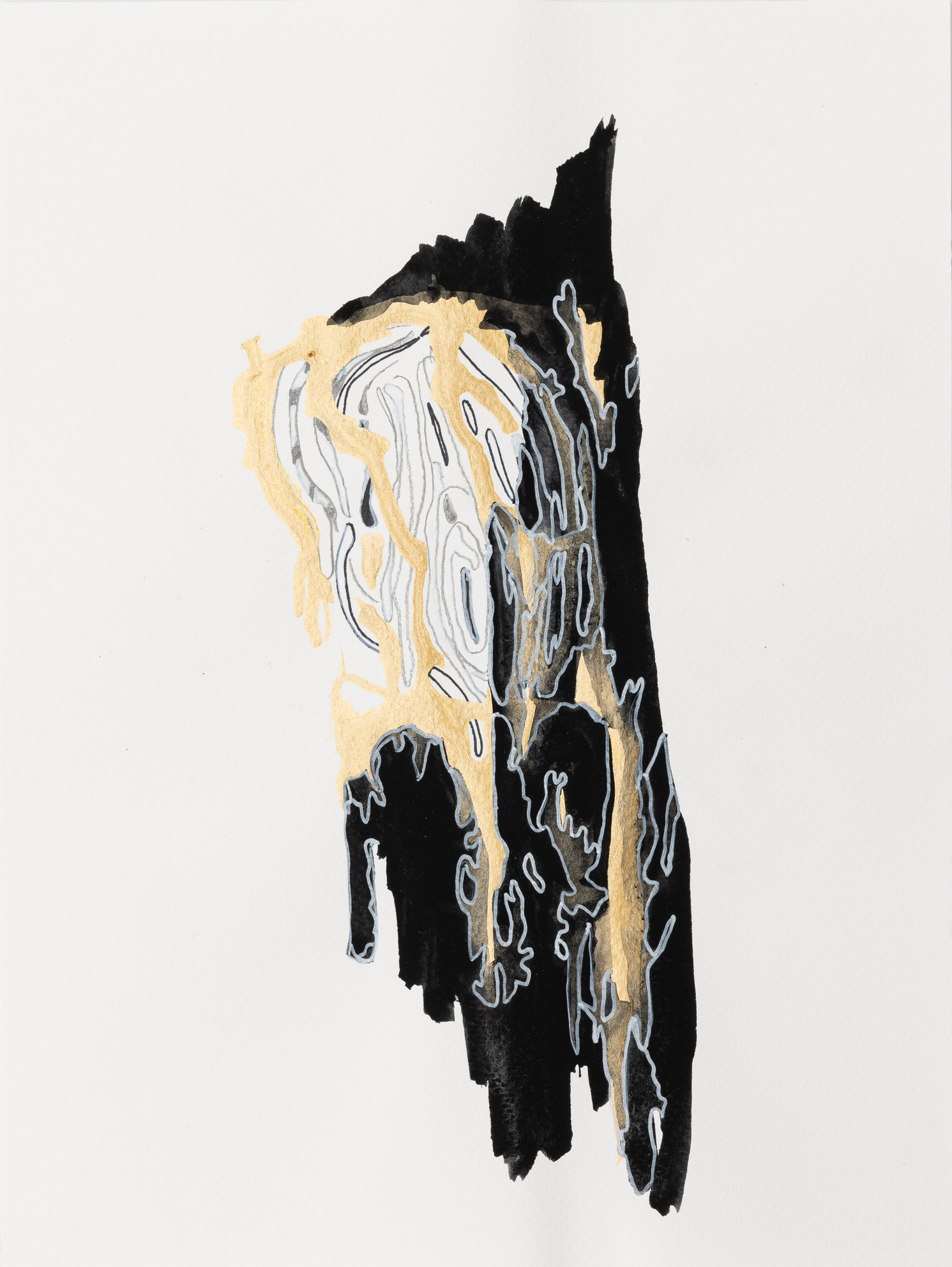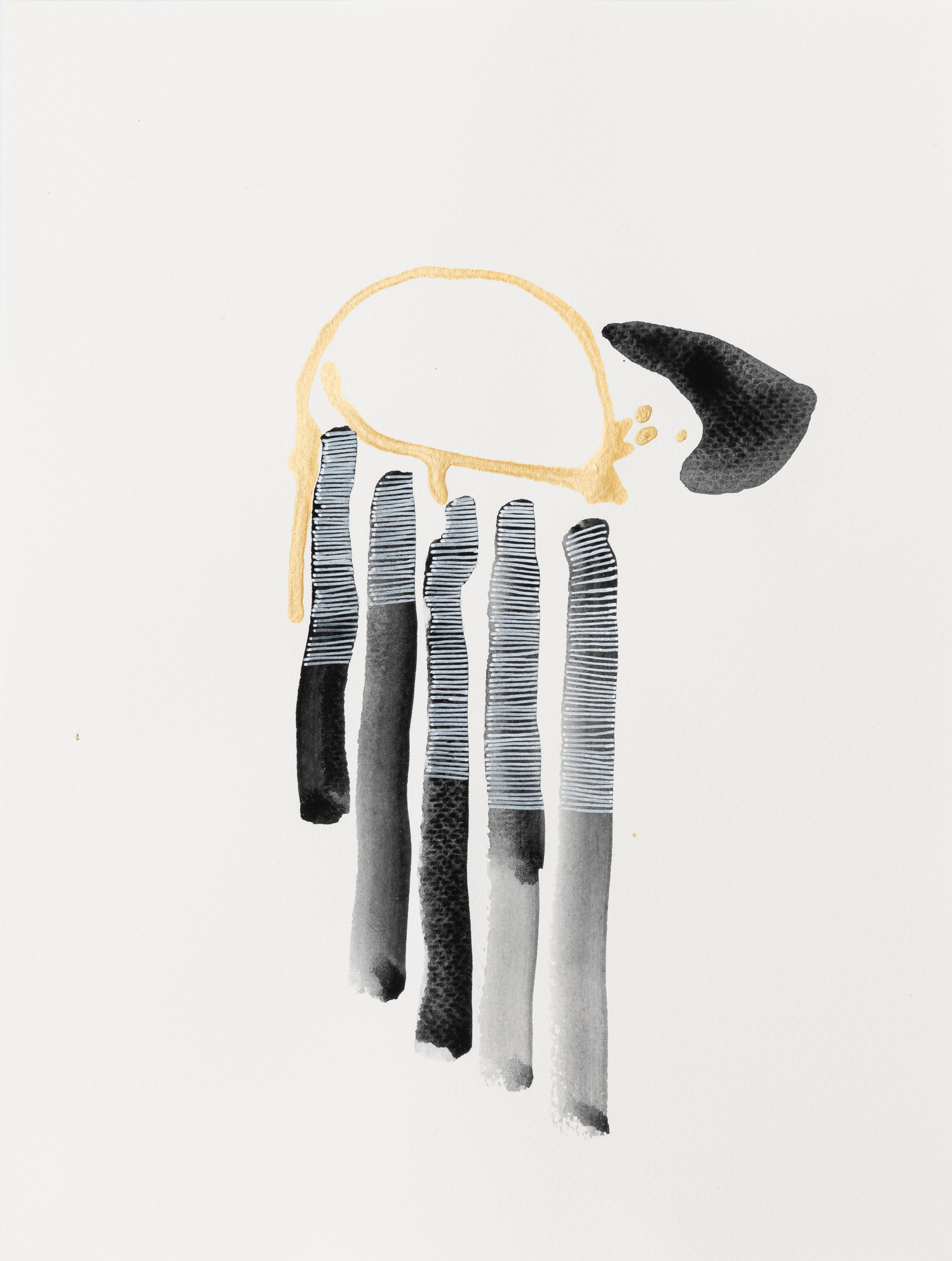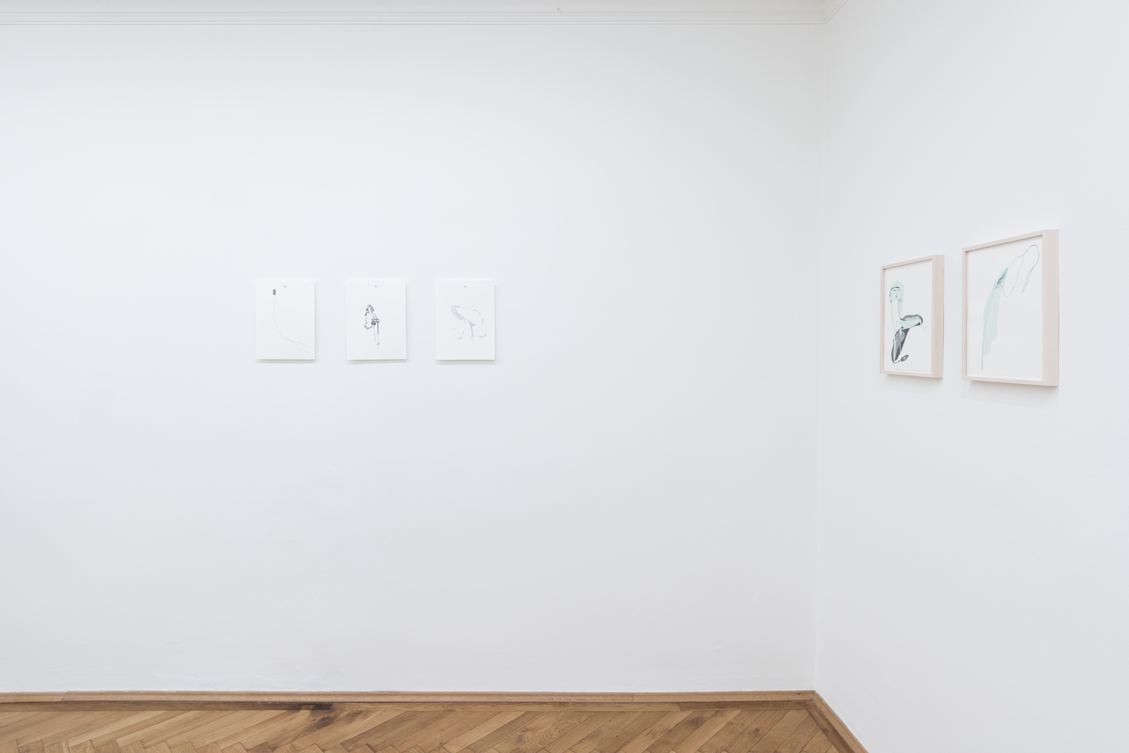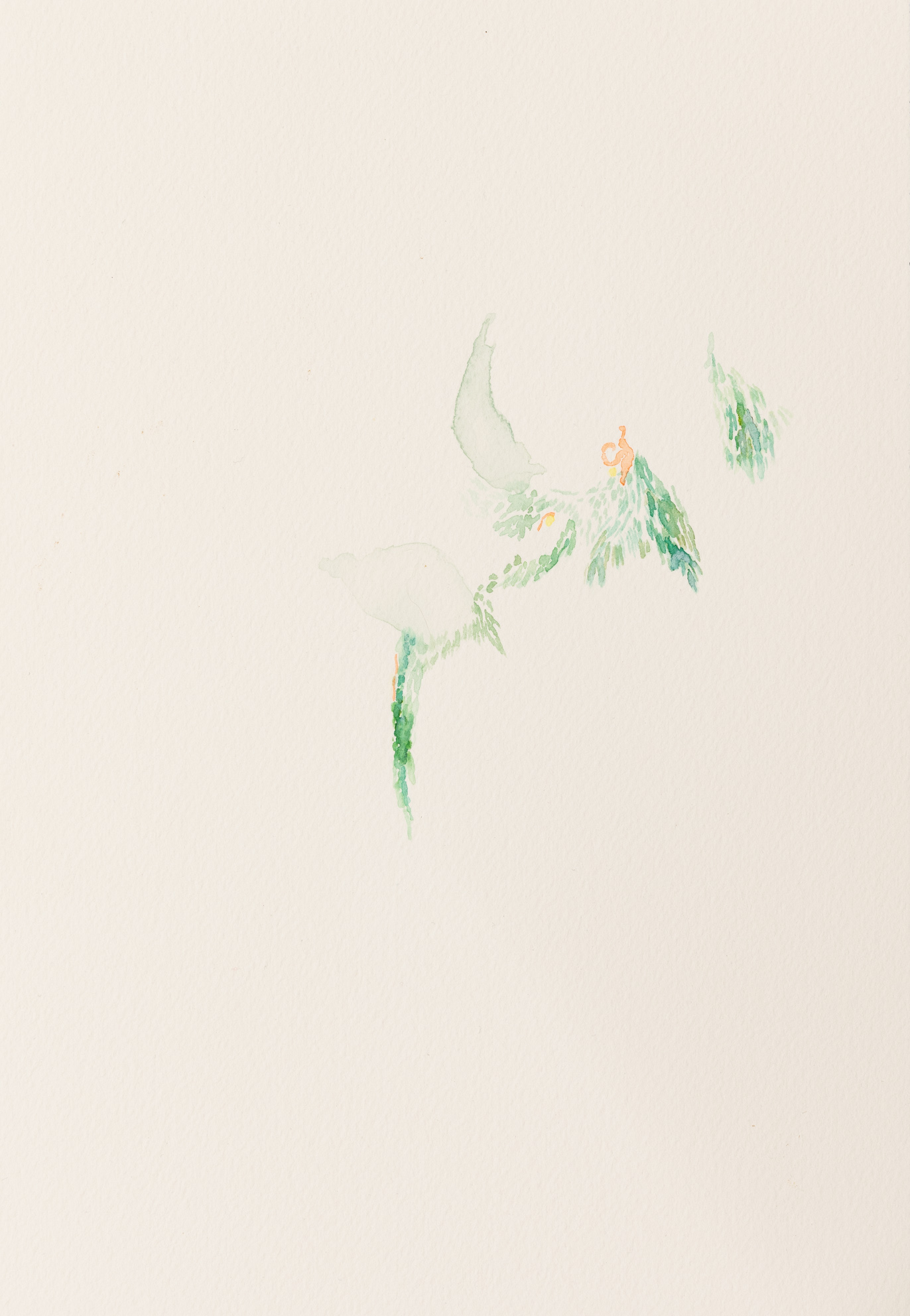 Laura Ní Fhlaibhín has always maintained a drawing aspect to her practice, as a means to access and nourish intuitive storytelling. Drawing is open-ended for her: there is a freedom in where the line will go, what images become central, who are the characters. Sometimes she works with pencil, or combines materials such watercolours, homemade inks such as oak gall, copper oxide and willow charcoal, with smears of lubricant and medicinal ointments. She works intuitively when she draws and finds the possibilities when faced with a blank sheet/page/pad to be both parts exhilarating and nerve wracking. Once marks are made, the drawings take on their own life, preoccupations come into focus; maybe it’s a gathering of kin spirits, or a charged tree branch, or a swollen intestinal inflammation.