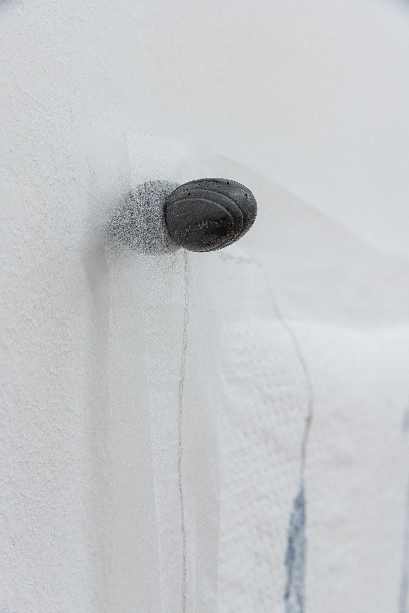 Graphite, iodine tincture, willow charcoal, sudocreme, KY jelly, chalk and lapus lazuli, Egyptian blue and Indigo pigments, gum arabic, carbon, cherry pit ink on an incontinence pad, held by mini-egg magnets, cast in jesmonite
