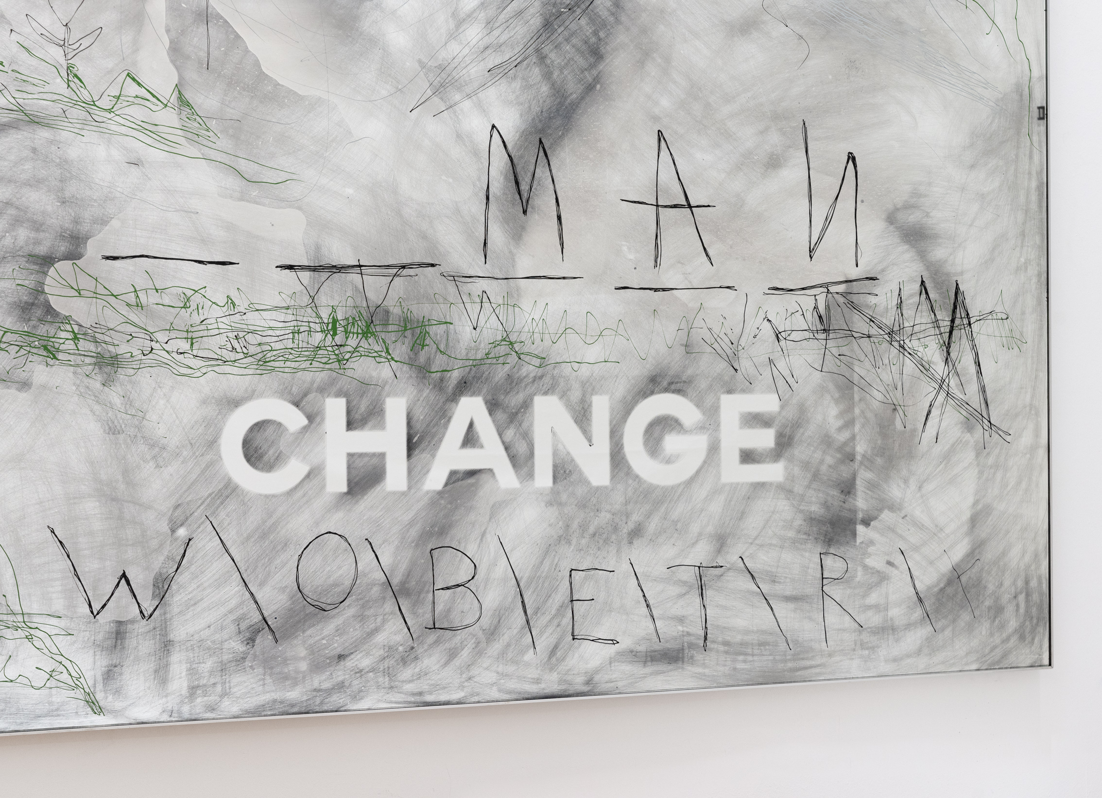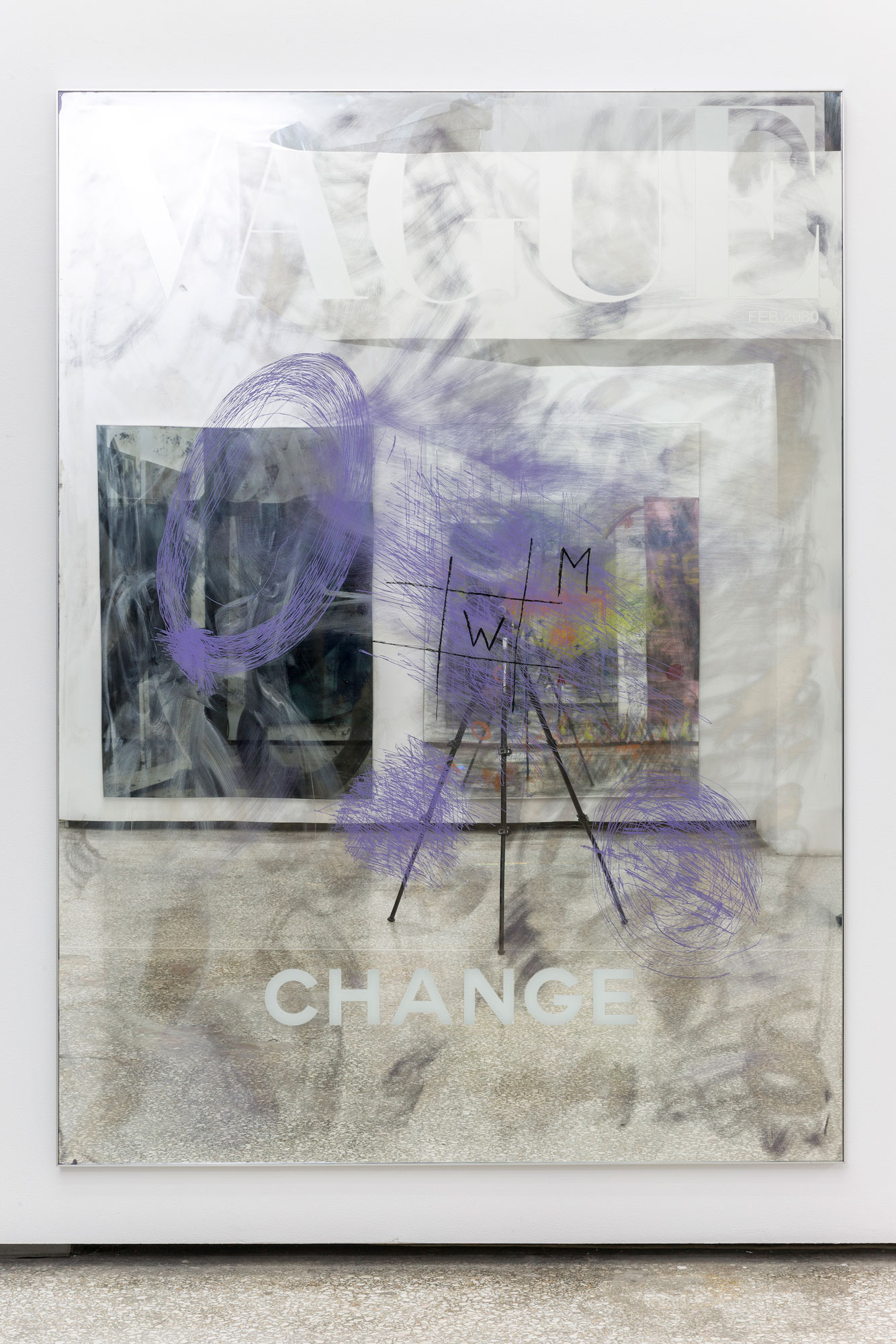 Bleached and scratched mirror, epoxy paint, aluminum frame