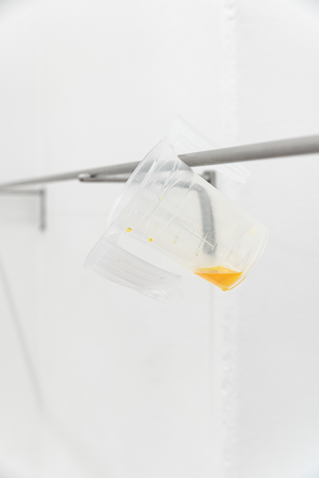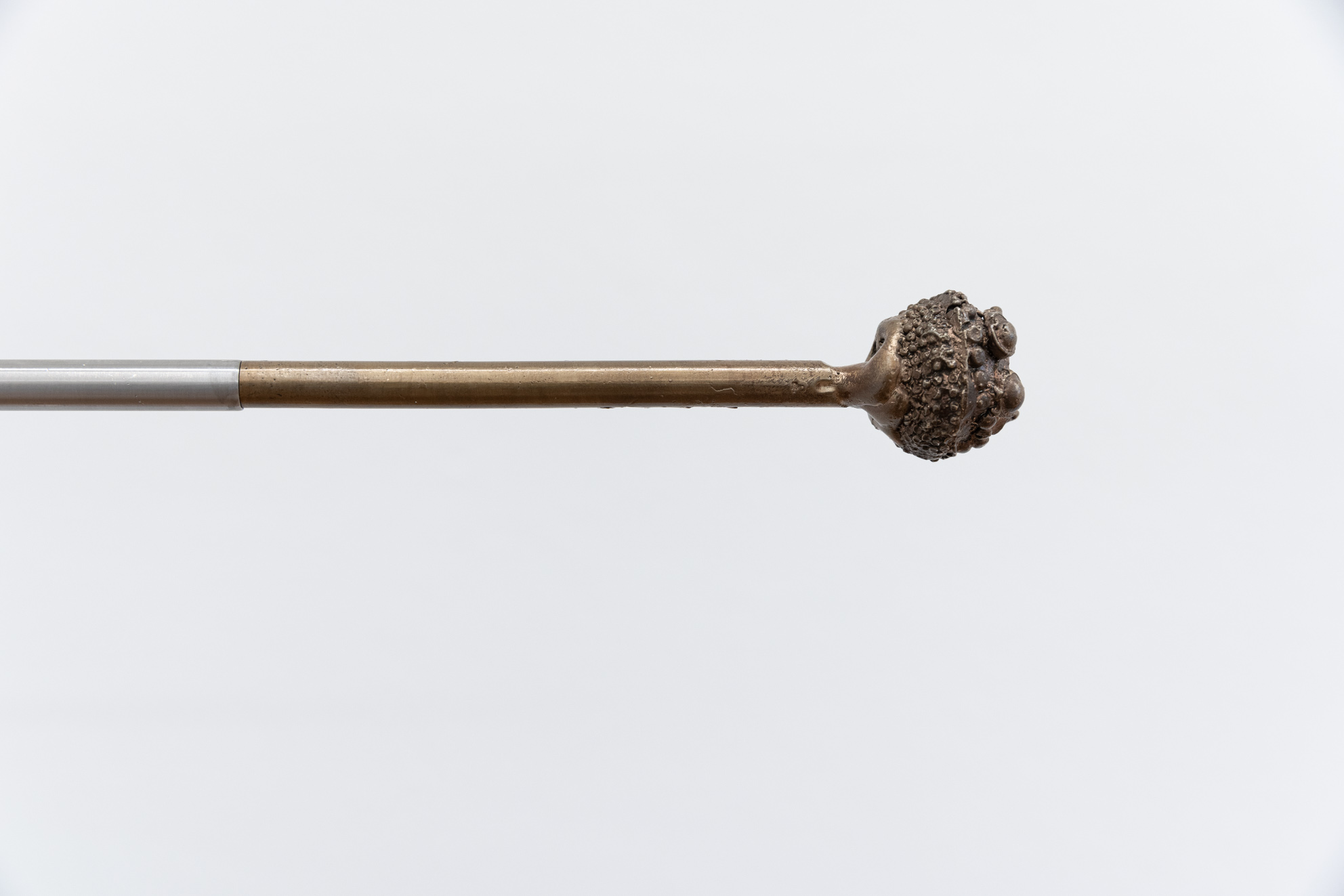 Stainless steel and bronze spear, bronze amulet cast from great aunt Bridie’s gift, holding an adult-sized, melted medical plastic drinking beaker, sweet almond oil